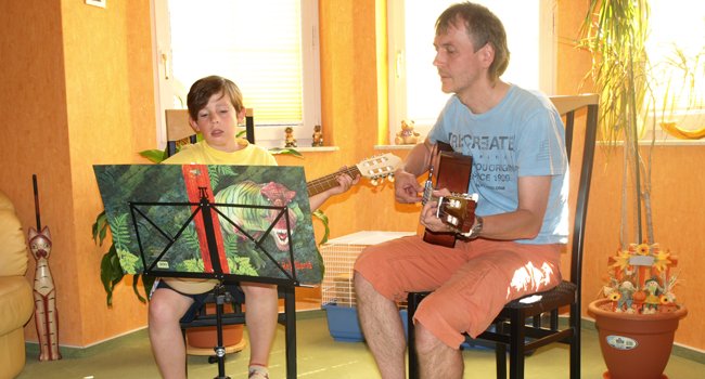 So wird es oft passieren, daß ich mit dem Saxophon oder mit der Gitarre zum Unterricht komme und wir gemeinsam "Musik machen".