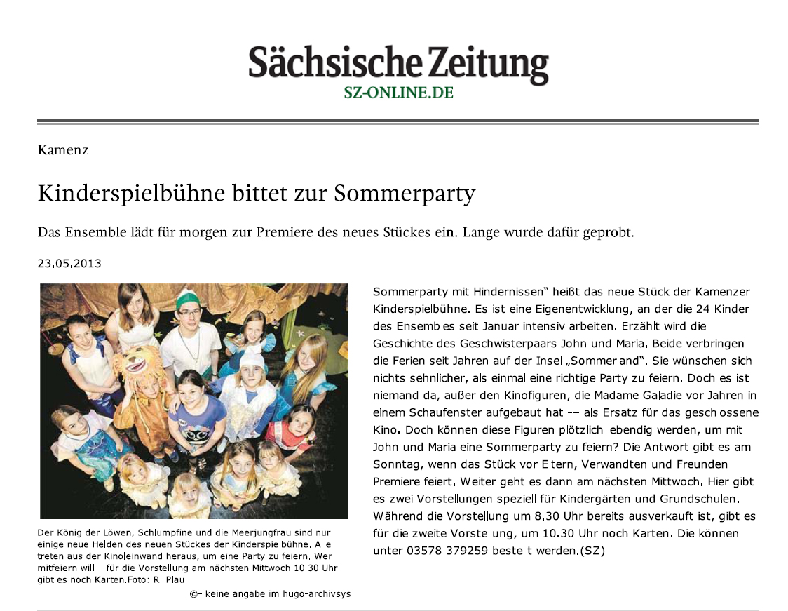 Wieder in Zusammenarbeit mit Ina Riedel und der Kinderspielbühne Kamenz e.V. entsteht im Moment (März/2013) das Theaterstück "Sommerparty mit Hindernissen". Meine Aufgabe sind die Kompositionen und Arrangements der Musik. Eingesungen werden die Tracks von den Kindern der Kinderspielbühne Kamenz.